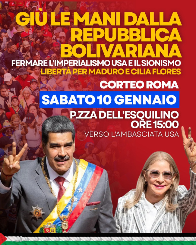 Scendiamo in piazza per dimostrare la nostra solidarietà internazionalista al Venezuela, contro l’imperialismo Usa e i governi, come quello Meloni, che appoggiano il genocidio sionista in Palestina e l’aggressività degli Stati Uniti e il recupero colonialista della dottrina Monroe in America Latina