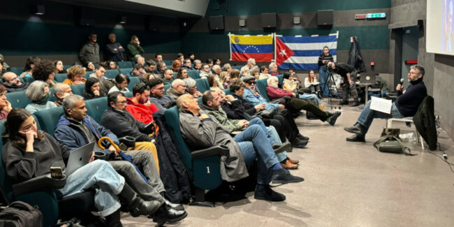 Le videoregistrazioni dell’Assemblea al fianco del Venezuela e Nuestra America. Le videoregistrazioni dell’Assemblea al fianco del Venezuela e Nuestra America. L’assemblea nazionale “Bring them home!”, svoltasi al Nuovo Cinema l’Aquila a Roma, lo scorso 8 febbraio ha rilanciato con forza la campagna di liberazione per il legittimo presidente venezuelano Nicolás Maduro e la “prima combattente” Cilia Flores, oltre a ribadire il proprio caloroso sostegno ai processi di transizione socialista ed alle esperienze progressiste in America Latina minacciati dall’aggressività dell’imperialismo statunitense. In una sala piena, per circa due ore e mezza, si sono succeduti numerosi interventi