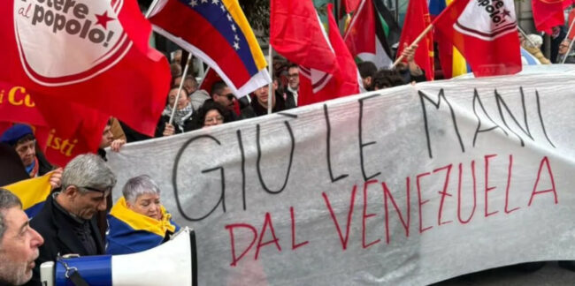 [Potere al popolo, Rete dei comunisti, Osa, Cambiare rotta, Usb, CAU] Il criminale e illegale bombardamento della Repubblica bolivariana del Venezuela e il rapimento del legittimo presidente Nicolas Maduro da parte dell’imperialismo degli Stati Uniti hanno trovato subito una risposta in tantissime piazze italiane. Da tutti gli angoli del Paese si sono alzate grida di condanna dell’atto terroristico internazionale statunitense e di solidarietà e vicinanza con il popolo venezuelano. La mobilitazione al fianco del processo rivoluzionario bolivariano ha toccato i palazzi di rappresentanza del governo Meloni, dell’Unione europea e degli Stati Uniti,